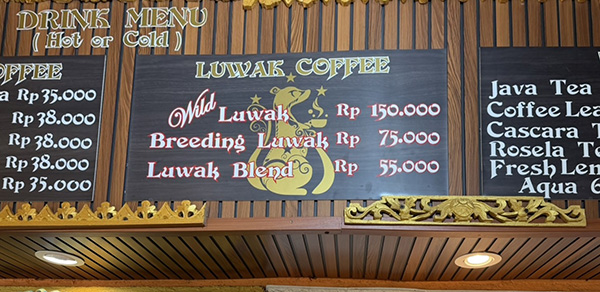 カミさんが義姉に写真を送ると、「あんた、日本じゃコピルアクは一杯8,000円とか1万円とかするんだよ!」と言っていたが、150,000ルピア(約1,500円)という値段は本場バリ島だからだったのか。