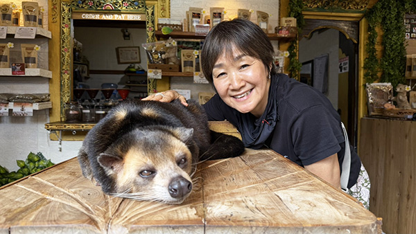注文を受けるカウンター側には本物のジャコウネコがいて、撫でたり抱っこしたりできる。