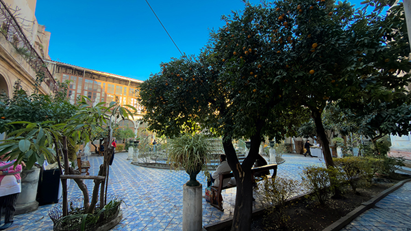 観光客たちはこの修道院の中庭のベンチでカンノーロを食べるのだ。