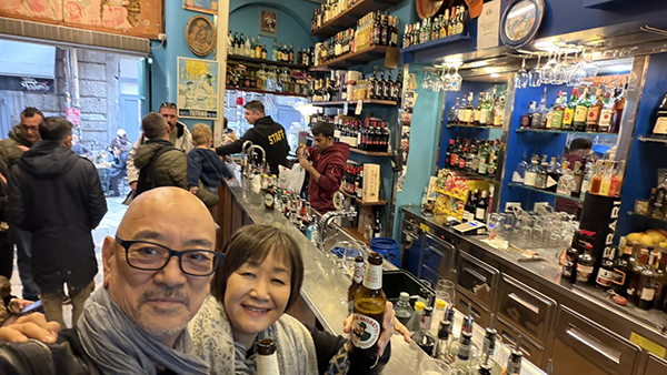 大声で女性に声かけながらパニーニを売る名物おじさんの店でパニーニとアランチーノというライスコロッケでイタリアビール。